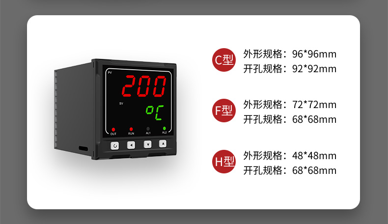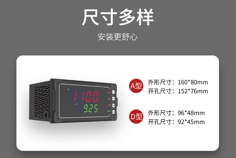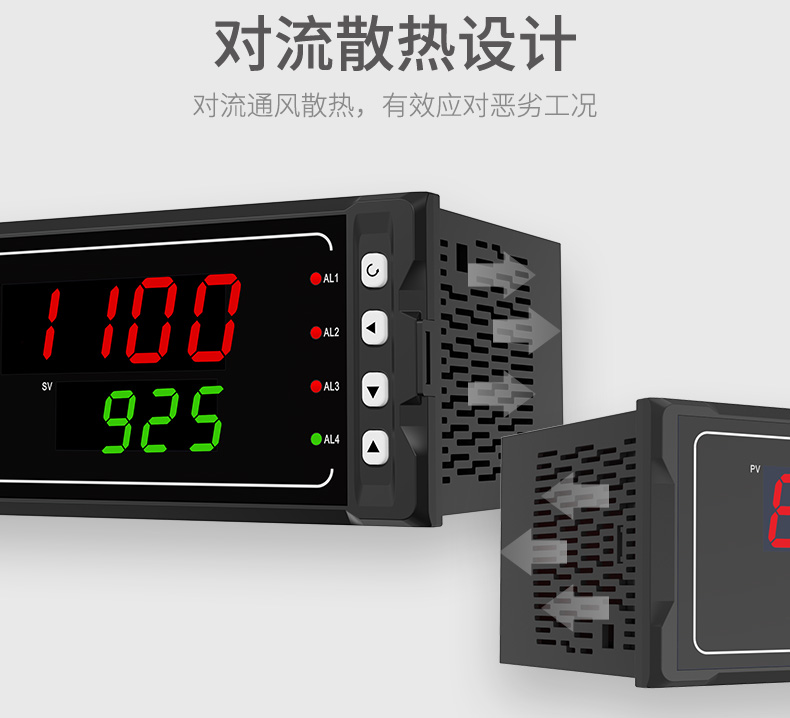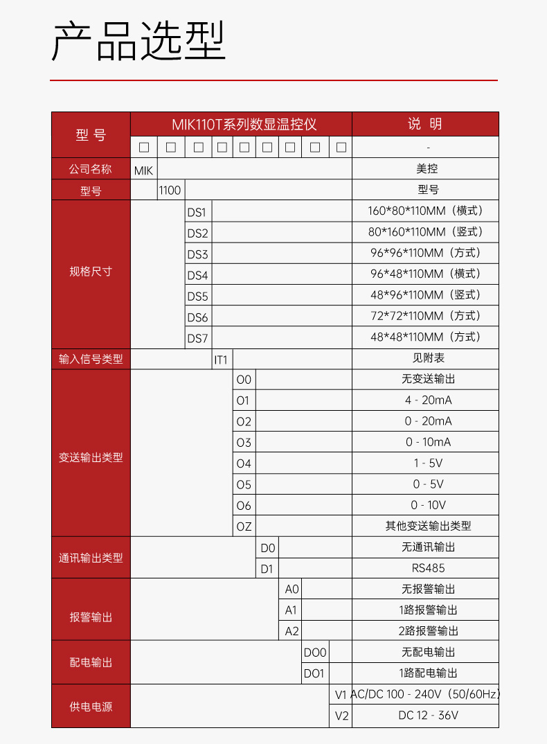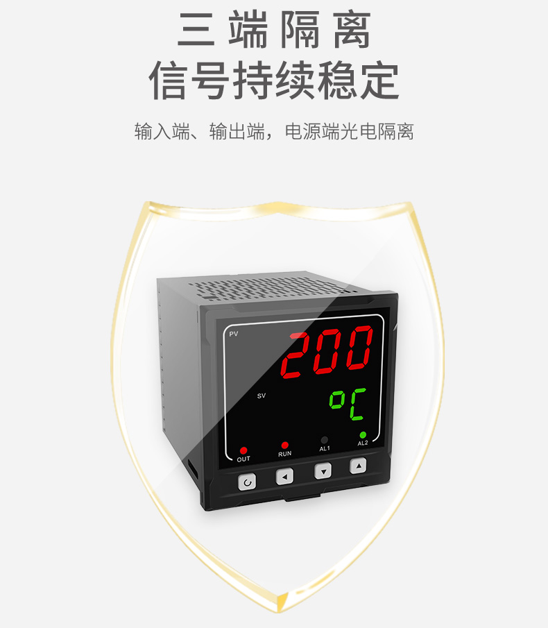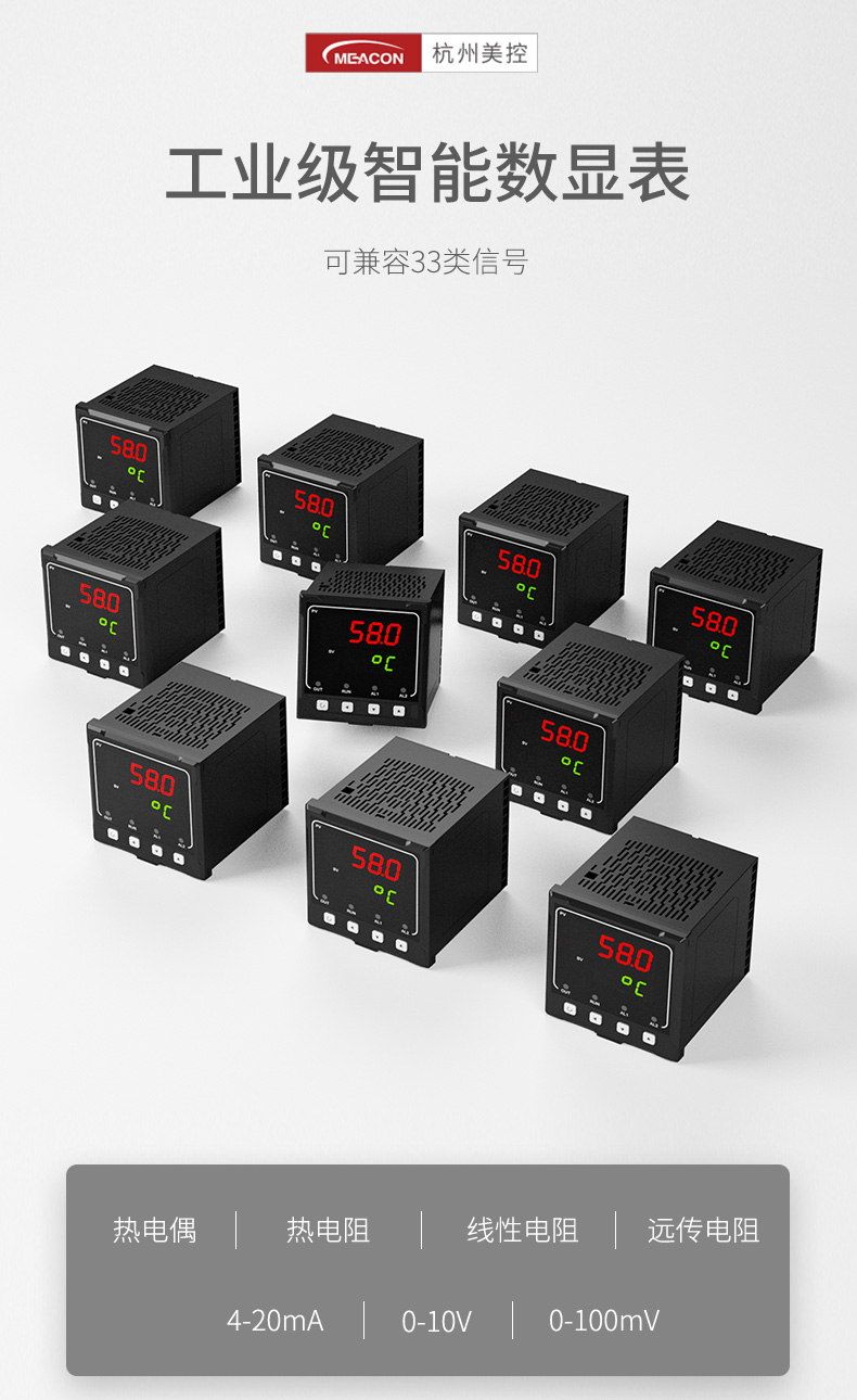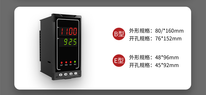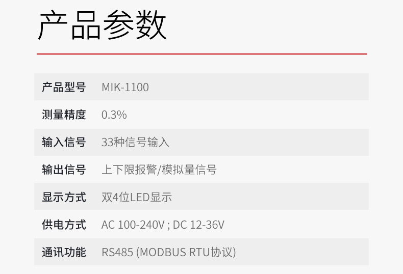 MIK1100系列單回路數(shù)字顯示控制儀(簡易型),傻瓜式操作,0.3級測量精度,7款外型尺寸,雙四位LED顯示,可支持熱電偶、熱電阻、電壓(可開方運(yùn)算)、電流(可開方運(yùn)算)及變送器輸入,適用溫度、壓力、流量、液位、濕度等工業(yè)過程量的監(jiān)測。支持2路報(bào)警功能,支持1路變送輸出或支持采用標(biāo)準(zhǔn)MODBUS協(xié)議的RS485通訊接口,1路DC24V饋電輸出,輸入端、輸出端、電源端光電隔離,100-240V AC/DC或20-29V DC開關(guān)電源供電,標(biāo)準(zhǔn)卡入式安裝,工作環(huán)境溫度在0-50℃,且相對濕度5-85%RH無凝結(jié)。