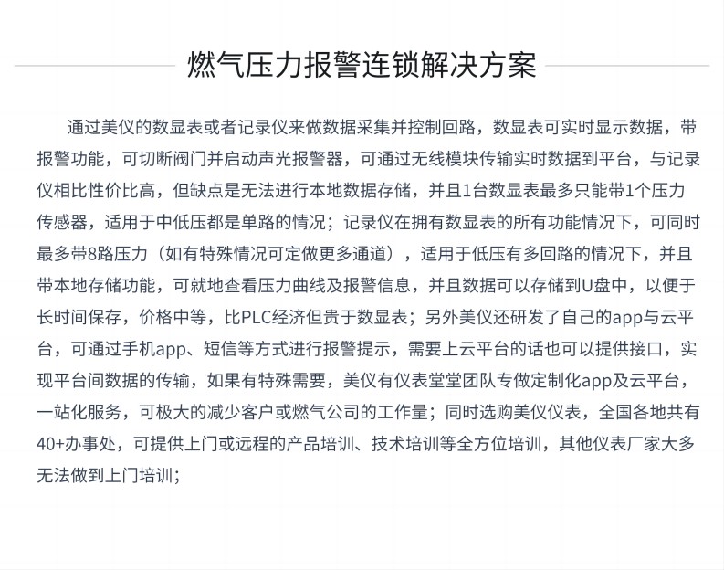 通過(guò)美儀的數(shù)顯表或者記錄儀來(lái)做數(shù)據(jù)采集并控制回路,數(shù)顯表可實(shí)時(shí)顯示數(shù)據(jù),帶報(bào)警功能,可切斷閥門并啟動(dòng)聲光報(bào)警器,可通過(guò)無(wú)線模塊傳輸實(shí)時(shí)數(shù)據(jù)到平臺(tái),與記錄儀相比性價(jià)比高,但缺點(diǎn)是無(wú)法進(jìn)行本地?cái)?shù)據(jù)存儲(chǔ),并且1臺(tái)數(shù)顯表最多只能帶1個(gè)壓力傳感器,適用于中低壓都是單路的情況;記錄儀在擁有數(shù)顯表的所有功能情況下,可同時(shí)最多帶8路壓力 (如有特殊情況可定做更多通道),適用于低壓有多回路的情況下,并且?guī)П镜卮鎯?chǔ)功能,可就地查看壓力曲線及報(bào)警信息,并且數(shù)據(jù)可以存儲(chǔ)到U盤(pán)中,以便于長(zhǎng)時(shí)間保存,價(jià)格中等,比PLC經(jīng)濟(jì)但貴于數(shù)顯表;另外美儀還研發(fā)了自己的app與云平臺(tái),可通過(guò)手機(jī)app、短信等方式進(jìn)行報(bào)警提示,需要上云平臺(tái)的話也可以提供接口,實(shí)現(xiàn)平臺(tái)間數(shù)據(jù)的傳輸,如果有特殊需要,美儀有儀表堂堂團(tuán)隊(duì)專做定制化app及云平臺(tái),一站化服務(wù),可極大的減少客戶或燃?xì)夤镜墓ぷ髁?,同時(shí)選購(gòu)美儀儀表,全國(guó)各地共有40+辦事處,可提供上門或遠(yuǎn)程的產(chǎn)品培訓(xùn)、技術(shù)培訓(xùn)等全方位培訓(xùn),其他儀表廠家大多無(wú)法做到上門培訓(xùn)。