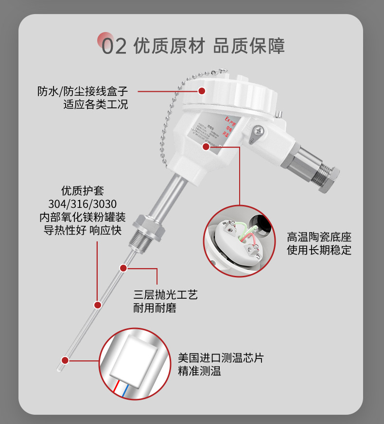 隔爆鎧裝熱電阻MIK-TSR/熱電偶MIK-TSRG隔爆溫度傳感器全部采用的進(jìn)口芯體,采用不銹鋼外殼,從而達(dá)到穩(wěn)定性好,精度高,抗震性能強(qiáng)等特點。目前市場上熱電阻主要是Pt100,熱電偶主要是K型、T型、S型、R型、B型、N型、E型、J型等8種常規(guī)型號,具體現(xiàn)場需要熱電阻還是熱電偶,主要根據(jù)現(xiàn)場測溫精度與測溫范圍確定。