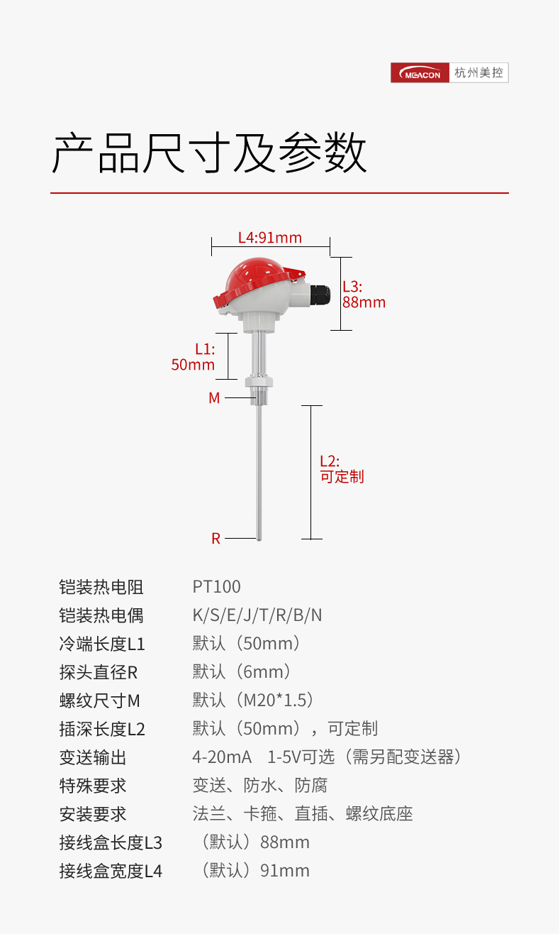 美控鎧裝熱電偶 k型熱電偶溫度0-1250℃